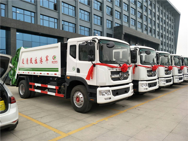 此次軍港采購(gòu)的這些壓縮式垃圾車采用東風(fēng)多利卡D9系列駕駛室底盤改裝,垃圾箱容積12立方米,康明斯180馬力發(fā)動(dòng)機(jī),后帶斗翻轉(zhuǎn)機(jī)構(gòu),帶PLC一鍵控制,操作方便。